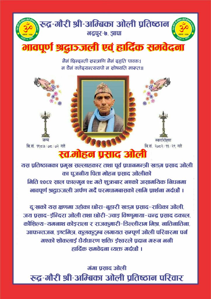 यस प्रतिष्ठानका प्रमुख सल्लाहकार तथा पूर्व प्रधानमन्त्री खड्ग प्रसाद ओली का पुजनीय पिता मोहन प्रसाद ओलीको मिति २०८२ साल फाल्गुन २९ गते शुक्रबार भएको असामयिक निधनमा भावपूर्ण श्रद्धाञ्जली अर्पण गर्दै परमधामबासको लागि प्रार्थना गर्दछौं ।